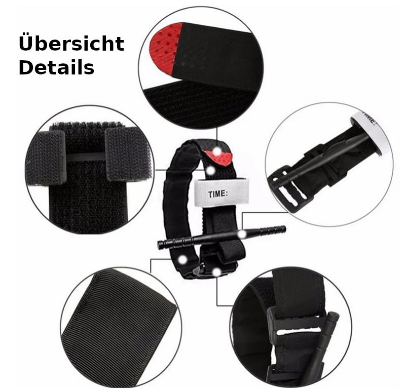 Überwachung und Dokumentation: Die Uhrzeit des Anlegens sollte notiert werden, um die Dauer der Anwendung im Auge zu behalten. Ein Tourniquet sollte nicht länger als notwendig angelegt bleiben, um Gewebeschäden zu vermeiden.